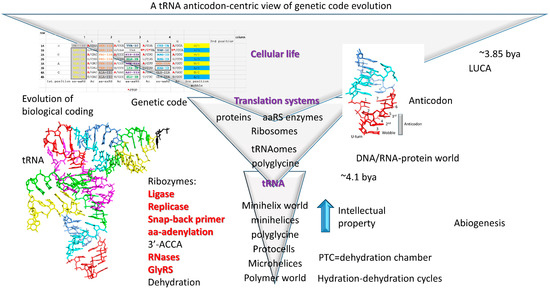 - Di Giulio, M. A comparison among the models proposed to explain the origin of the tRNA molecule: A synthesis. J. Mol. Evol. 2009, 69, 1–9. [Google Scholar] [CrossRef] [PubMed]