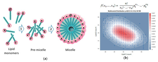 Figure 1. Micelle dynamics and statistics. (a) Accretion of lipid micelle with a premicellar intermediate. Shown is a lipid repertoire with a diversity of NG = 6, a premicelle with n = 8 monomers, and a micelle with n = 21 monomers (numbers are for illustration only, see Table 1). (b) The multinomial distribution statistics of mixed micelle dynamics. Shown is an example statistic for n = 100 and three lipid types and equal Pi values (Table 1). Premicelle is nucleated at random with a relatively high probability f = 3.0 × 10−3. The micelle is illustrated as growing by a certain degree of homeostatic growth, to be assessed by compositional correlation, from the premicelles, reaching a low-probability composition with f = 5.6 × 10−5. Importantly, beyond the transition to low probability composition, which signifies an entropy decrease upon growth, there is a clear sign of homeostatic growth manifested in the high normalized dot product H = 0.98 between the premicelles and the fully grown micelle (see [11]), as compared to H = 0.72 ± 0.04 for randomized compositional vectors for the micelle. Figure modified from: https://blogs.sas.com/content/iml/2013/08/05/simulate-from-multinomial-distribution.html and multinomial distribution formula from: http://www.real-statistics.com/binomial-and-related-distributions/multinomial-distribution/. - We will examine the net incoming time-dependent amphiphile fluxes for a correlation of their compositional direction to that of the initial premicelles. Such correlation will provide evidence of compositional preservation, the hallmark of homeostatic growth, and an equivalent to compositional replication/reproduction [8].