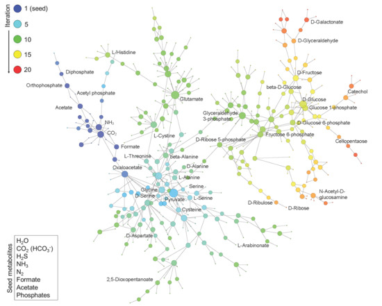 Construction of Phosphorus-Dependent Metabolic Network. Network expansion simulation was executed using a set of defined seed compounds (bottom left box) and all balanced reactions in the background metabolism pool derived from the updated KEGG reactions. The figure displays the obtained phosphorus-dependent network in which metabolites are linked if they have a reactant-product relationship during the expansion. The metabolites generated at different iteration steps during the network expansion process are represented by nodes in different colors. The size of node represents the degree of the node, i.e., the number of reactions added in the subsequent iteration.
