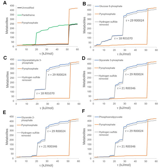 Thermodynamically Constrained Network Expansion. Thermodynamically constrained network expansion was simulated by using different seed sets. Endergonic reactions with ΔGr0 exceeding a thermodynamic threshold τ were defined as impossible. For each value of τ (x axis), we plotted the size of the final expanded network in terms of the number of metabolites (y axis). (A) displays the comparison of the network sizes of the unmodified phosphorus-dependent network (black line), the pyrophosphate-coupled network (with the addition of pyrophosphate in the seed set) (orange line), and the pantetheine-coupled network (with the addition of pantetheine in the seed set) (green line) at different thermodynamic thresholds, τ. (B–F) display the comparison of the network sizes of the pyrophosphate-coupled network (orange line), the phosphorylated intermediates-coupled network (blue line), and the phosphorylated intermediates-coupled network without hydrogen sulfide (gray line) at different thermodynamic thresholds, τ. The thermodynamic bottlenecks and the reactions limiting the scale of different phosphorylated intermediates-coupled networks are shown in corresponding figures. The used phosphorylated intermediates include: glucose 6-phosphate (B), glyceraldehyde 3-phosphate (C), glycerate 2-phosphate (D), glycerate 3-phosphate (E), phosphoenolpyruvate (F).
