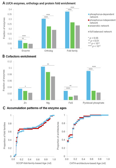 The ancient origin of the phosphorus-dependent metabolic network was evaluated by the biological characteristics of the network. We analyzed enzymes of the phosphorus-dependent network to explore the potential biological features associated with ancient metabolism. The phosphorus-dependent network was found to be enriched with the enzymes, orthologs and protein fold families of LUCA (p < 10−2, Fisher’s exact test, Figure 3A). This result implied that a great portion of the reactions in the phosphorus-dependent network existed in the early life. This network was also enriched with the enzymes which contained metal cofactors Mg2+, Zn2+ and FeS (p < 0.05, Fisher’s exact test, Figure 3B). The relative higher requirement for metal ions might be a remnant of prebiotic catalysts, because existent enzymes may still retain characters of prebiotic catalysts, such as usage of metal cofactors [43,44]. Moreover, pyridoxal phosphate was considered to play a critical role in prebiotic transamination [45]. The enzymes using pyridoxal phosphate as a cofactor were also enriched in the network (p < 10−5, Fisher’s exact test, Figure 3B).