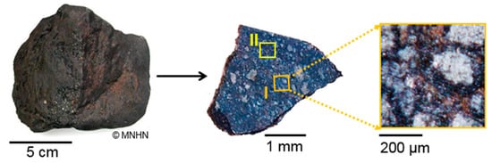 The analyses were performed at the SMIS (Spectroscopy and Microscopy in the Infrared using Synchrotron) beam-line of the synchrotron SOLEIL (France). A first series of IR measurements using the synchrotron source was performed before PIXE and SIMS measurements, using a NicPlan microscope (32× objective with numerical aperture of 0.65) coupled with a Magna 860 FTIR spectrometer (Thermo Fisher) operating in confocal reflection. A 20 × 20 µm² aperture was used to avoid diffraction effects in the minerals’ spectral absorption regions and to compensate for the low albedo of the meteorite. Spectra were recorded using an MCT (mercury cadmium telluride) single element detector in the mid-IR range (MIR: 7000–650 cm−1 or 1.4–15.4 µm) with a resolution of 4 cm−1 and with respect to a gold reference. In this first series, reflectance spectroscopy was measured on area I only, performing punctual measurements and mappings on selected regions of the area (Figure 2).