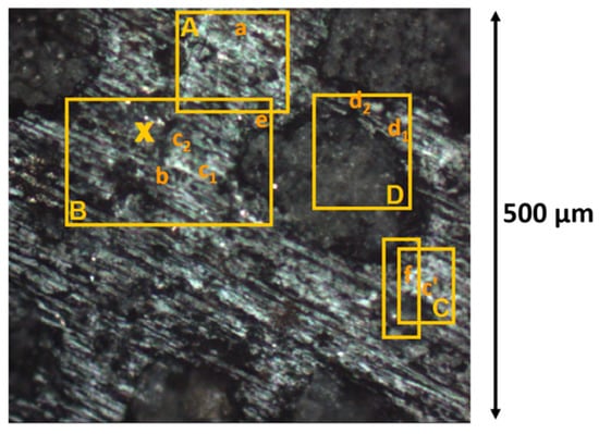 Optical image of the selected area I with in orange, the regions A, B, C, and D explored with IR reflectance spectroscopy and the synchrotron beam source. The letters a, b, c1, c2, c’, d1, d2, and f refer to the spectra shown in Figure 5 and indicate the location of each measurement. The large dark regions in the image correspond to chondrules. The “X” cross corresponds to a matrix region with a specific IR signature discussed in Section 3.3.