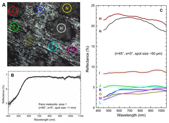 The analyses were performed at IAS laboratory (Institut d’Astrophysique Spatiale, Orsay, France) using a grating spectrometer Maya2000 Pro (Ocean Optics), coupled through optical fibers to a home-made system, allowing illumination at angles higher than 35° (an angle between 45° and 60° was used) and collection at a fixed angle of 0°. The spot on the sample surface was around 1 mm in diameter, slightly larger than the 500 × 500 µm² of the analyzed area I. We refer to this first configuration as “macro-reflectance”. The same fibers, source, and spectrometer were later coupled to a visible microscope to define another configuration (“micro-reflectance”) where the spot on the sample was close to 50 µm in diameter (using a ×20 objective). This allowed the spectral analysis of individual particles or small mineralogical and compositional features on a larger surface, to be related to macroscopic remote sensing observations of solar system objects. The setup and calibrations were described in a previous study []. In our system the sample was placed horizontally, and the vertical position was adjusted by maximizing the diffuse reflectance signal. Reference spectra were collected using 99% Spectralon standard (Labsphere) and double-checked using a BaSO4 standard. The spectral resolution was fixed at 1 nm.