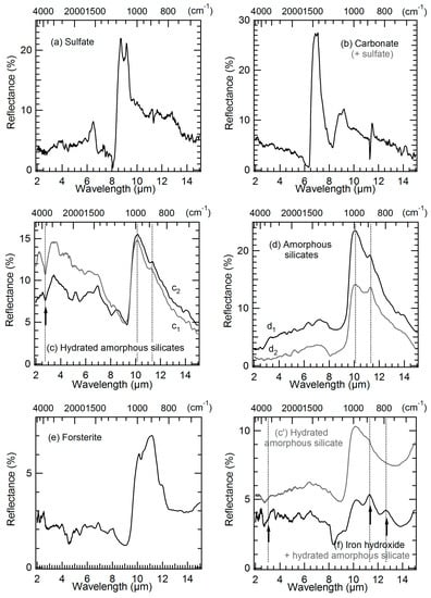 FTIR micro-reflectance spectra showing the major components found in the analyzed regions of the matrix of area I. (a) Sulfate spectrum. (b) Carbonate (mixed to some sulfate) spectrum. (c) Two hydrated amorphous silicate spectra (the arrow points to the hydroxyl absorption at 2.75 µm). (d) Two amorphous silicate spectra: d1 is more amorphized than d2 and possibly weakly hydrated. (e) Forsterite found in the matrix at the top right of region B (Figure 2). (f) An iron hydroxide (mixed to a hydrated amorphous silicate) found in regions A and C; the arrows point to its signature at ~3.1, 11.3, and 12.7 µm ((c’) is a hydrated amorphous silicate spectrum for comparison). A vertical offset has been applied on spectra d2 and c’ for a better visibility.