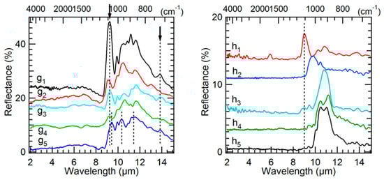 (g) FTIR micro-reflectance spectra of the region marked by an “X” cross in Figure 2. (h) FTIR micro-reflectance spectra of a chondrule region. A vertical offset has been applied on spectra g1, g2, g3, g4, h1, h2, h3, and h4 for a better visibility.