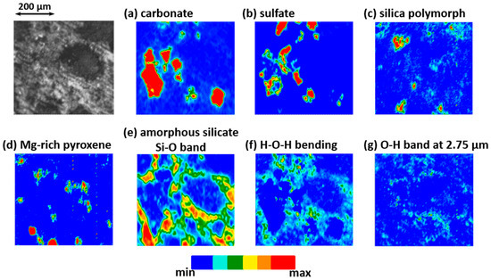 Infrared mapping of (a) the carbonate component, (b) the sulfate component, (c) the silica polymorph component at 9.22–9.13 µm, (d) the Mg-rich pyroxene (Mg/(Mg+Fe) > 80), (e) the amorphous silicate Si–O band at 10–10.25 µm, (f) the H–O–H bending band at ~6.25 µm, and (g) the O–H stretching band at 2.75 µm.