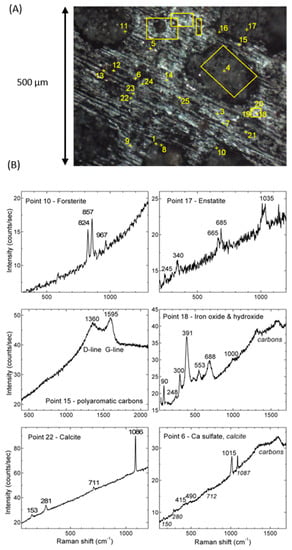 (A) An optical image of area I that shows in yellow the spots and regions explored by Raman spectroscopy. (B) Micro-Raman spectra showing the 6 components found in the analyzed points indicated by the number in panel A. (Point 15) polyaromatic carbon, (point 10) forsterite, (point 17) enstatite, (point 22) calcite (= calcium carbonate), (point 6) anhydrous calcium sulfate (mixed with some calcite and polyaromatic carbon), and (point 18) goethite (+ probably hematite contribution).