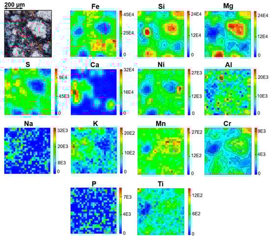 Figure 9 presents the mappings of Fe, Si, Mg, Ni, Ca, S, Ti, Mn, Na, K, Al, and Cr as obtained by micro-PIXE on area I of the meteorite fragment.