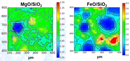 Figure 11c,d show the overlay distributions of calcium and silicon on one hand, and silicon and sulfur on the other hand, in area I. Apart from the chondrules, two specific Si-rich spots appear. The first one, on the top left of area I is also rich in Mg (MgO/SiO2 ~0.8–0.9) aside from Ti, Mn, and Cr, and is just next to an aluminum-rich spot. The second Si-rich spot is in the middle left of area I. It is surrounded by a Ca-rich region and is lacking all the metals such as Mg, Fe, Cr, Mn, Ni, and Ti. Then, this Si-rich spot could correspond to a silica-rich polymorph or less likely due to its size, to silicon carbide.