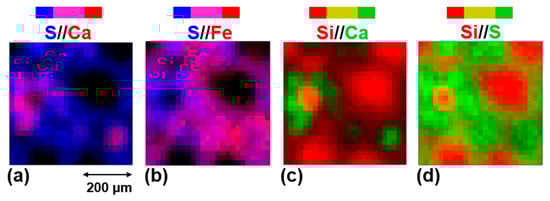 Micro-PIXE images overlaying different element mappings. Sulfur (blue) and calcium (red) are mapped in image (a), sulfur (blue) and iron (red) are mapped in image (b), silicon (red) and calcium (green) are mapped in image (c), and silicon (red) and sulfur (green) are mapped in image (d). Pink areas correspond to a co-localization of sulfur with either Ca (image (a)) or Fe (image (b)). Green-yellow hues correspond to a co-localization of silicon with either Ca (image (c)) or S (image (d)).