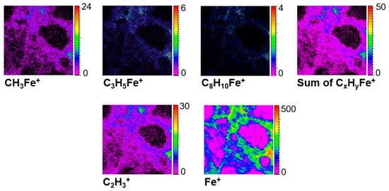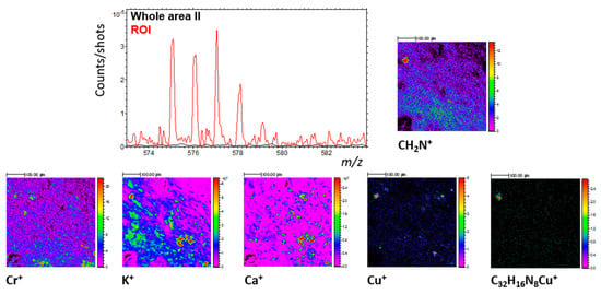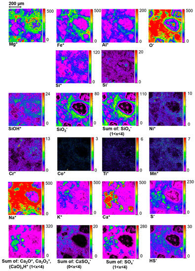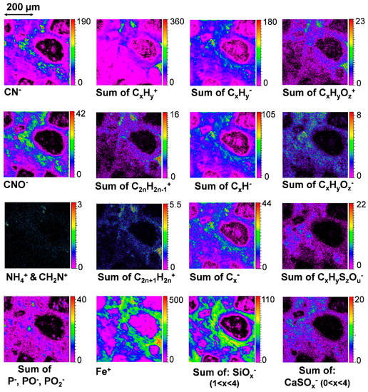 From the images collected on area I, it can be seen that many elements such as Ca+, K+, Mg+, Si±, S−, and Fe+ are emitted from specific regions (Figure 12). These element mappings are mostly consistent with the micro-PIXE results. This first information helps to confirm that these elements and the corresponding minerals probed by TOF-SIMS are not due to a superficial contamination and are well representative of the first top microns of the sample.