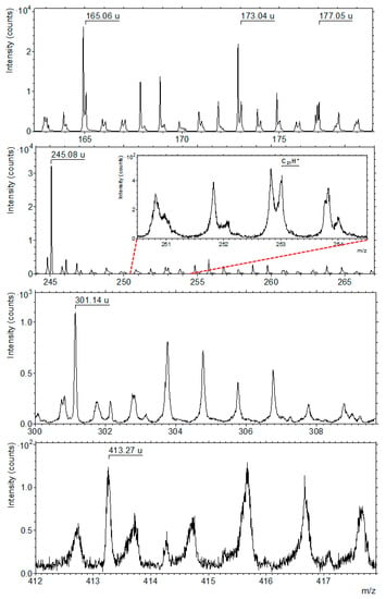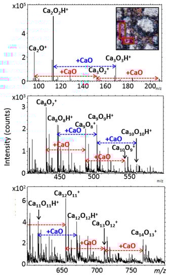 The identification of calcium sulfate and calcium carbonate is another example where the analysis of the whole mass spectrum turned to be a powerful tool for chemical characterization. Indeed, the mappings (Figure 12) show that sulfur oxide anions (SO−, SO2−, SO3−, SO4−) are emitted from the same area as Ca+. Moreover, sulfur oxide ions come from the same region of the matrix giving rise to the CaSOx− anions (mapped in Figure 12). Thus, TOF-SIMS analysis in negative mode allows the identification and precise localization of calcium sulfate in area I and confirms IR and Raman results. However, the mapping of Ca+ is not totally correlated to the distribution of sulfur-bearing ions, CaS− and CaSOx−. The main part of CaS− and CaSOx− emission is located in the top of the image and not everywhere the maximum of calcium emission is found (see Figure 12). In fact, Raman measurements detect calcite, a carbonate also seen in IR spectra, that co-exists with the calcium sulfate in that region. For this sample, TOF-SIMS does not detect the carbonate ion CO3−. This is probably due to a specific “matrix effect” (this anion is observed when a pure crystal, a pure powder of calcite, or some other mixtures containing calcite are measured []). However, the absence of the carbonate ion does not mean that TOF-SIMS does not measure a carbonate fingerprint. Indeed, the positive mode spectrum corresponding to the main calcium region (at the central left of area I) is presented in Figure 14. It shows two mass distributions of calcium oxide and hydroxide cations, based respectively on Ca2O+ and Ca2O2H+ with a repeating pattern corresponding to CaO mass difference between peaks, in both cases. For the first distribution, CaxO(x−1)+ peaks are detected up to x = 18, and for the second one, (CaO)xH+ peaks are detected up to x = 12 (Figure 13). According to a previous study [] and measurements on standards, the first pattern is the main signature of the calcium carbonate and the second one emerges principally from the calcium sulfate. Thus, the calcium carbonate location can be deduced by comparing CaxO(x−1)+ and (CaO)xH+ ion mapping to CaS− and CaSOx− ion mapping: the common location regions correspond to the sulfate, and the others to the carbonate (Figure 12). This result about the Ca-carbonate/sulfate identification and location is also supported by micro-PIXE mappings (Figure 9 and Figure 11). Additionally, TOF-SIMS and micro-PIXE elemental mappings (Figure 13 and Figure 9) show that this sulfate and carbonate region is the main “source” of potassium, but with large variations of its concentration in that region. The signals’ maxima are also different depending on the technique applied (As explained in Section 2, both techniques explore different depths of the sample). This indicates a variable amount of K in the carbonate and sulfate mixture.