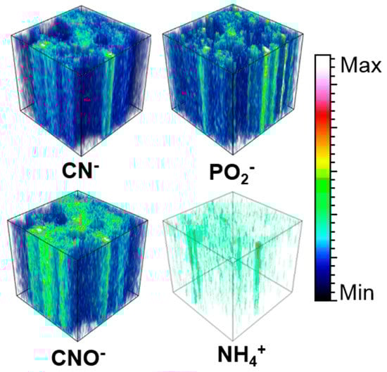 CN− and CNO− ions’ localization mostly coincide with CxHy− ions. However, part of CN− and CNO− ions are concentrated in specific small regions of a few tens of µm2 and less, that do not exactly match CxHy− -richest spots. These small domains have also been observed in area II. When analyzed in “depth” thanks to the dual beam mode (dynamical sputtering with the Ar beam), the signal of CN− and CNO− remain as high as on the surface and reveals that part of these ions are coming from inclusions embedded in the matrix. An example of this distribution in the depth is shown in Figure 15 for area I. The other ions presented in this Figure, PO2− and NH4+ are also emitted from specific volumes but only CN−, CNO−, and NH4+ have corresponding spatial distributions.