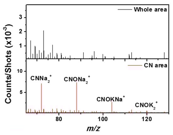 The selection of a region of interest (ROI) corresponding to the whole CN− and CNO−-rich areas gives a surprising TOF-SIMS spectrum in positive mode, presented in Figure 16: the mass spectrum is dominated by adduct ions or fragment ions combining CN and CNO with sodium and/or potassium. Some of the major ions identified in the positive spectrum of the selected ROI are: CNNa+, (CNNa)Na+, (CNNa)2Na+, (CNONa)Na+, (CNONa)2Na+, (CNOK)K+, (CNOK)2K+, and (CNOK)CNONa+. This cluster signature together with the 3D analysis excludes a superficial contamination and indicates the presence of cyanide and/or cyanate salts embedded in the matrix.
