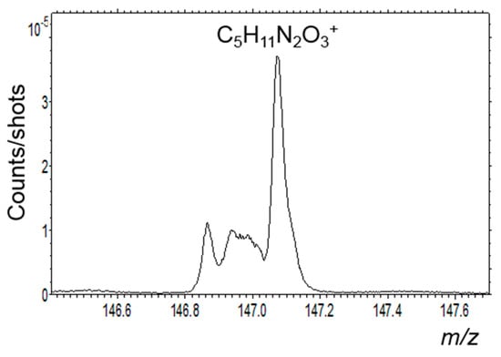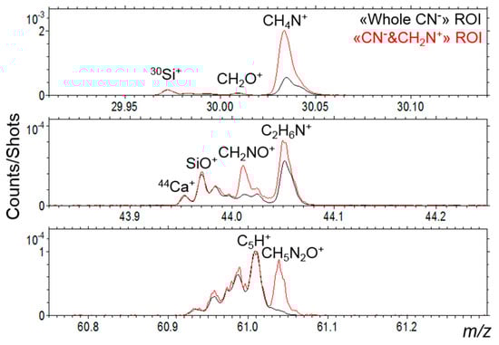 TOF-SIMS analyses were performed using 25 keV Bi3+ primary ions, with a beam current around 1 pA and a total ion dose of respectively, 5 × 1011 ions/cm2 for area I, and 1 × 1012 ions/cm2 for area II. This beam permitted to acquire ion images with a good spatial resolution of around ~1 to 2 µm. In these experiments, the beam spot size ranged from 400 nm to 1 µm and the mass spectra were acquired with a FWHM mass resolution ranging from 3000–5000, e.g., 3345 for C2H5+ (m/z 29.04) and 5370 for Ca2O2H+ (m/z 112.92). The mass resolution and the good mass calibration due to the use of very well-known ions like elements and inorganic clusters, allowed to separate the isobaric masses and to determine masses with an accuracy better than ±20 ppm [,]. This allowed a very good separation between organic and inorganic fragments and ions. All the spectra were acquired with the mass range 1–3000 u.