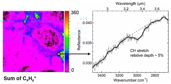 Finally, in region A and C in Figure 2, some IR spectra showed a small absorption band around 3.33–3.51 µm (2850–3000 cm−1), generally situated in the shoulder of a more intense OH absorbance band related to a hydrated amorphous silicate contribution (right panel in Figure 23). This small absorption, not always easy to distinguish from the noisy base-line in that spectral region, is due to C–H stretching vibrations and thus attributed to an organic content in the matrix. It is more precisely co-located with part of the hydrated amorphous silicates. As explained above, the spectra are measured in the reflectance mode on the rough meteorite fragment. The C–H (and O–H) stretching vibrations observed are necessarily due to volume scattering. Even though the C–H (and O–H) band intensity is very small compared to the Si–O bands and to what is obtained in transmission measurements [,], the organic local content must be quite important to be observed in these reflectance spectra.