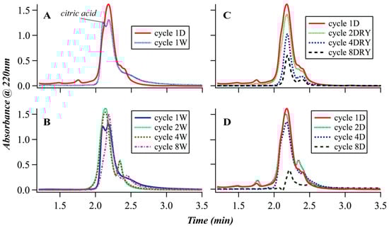 Size exclusion chromatography (SEC) analysis of the citric acid glycerol polymerization products (A) Comparison between the samples collected at the end of the first dry and wet cycle; (B) Comparison between the samples collected at the end of wet cycles (W series); (C) Comparison between samples of the DRY series; (D) Comparison of the samples collected at the end of dry period in the cycled series (D series).