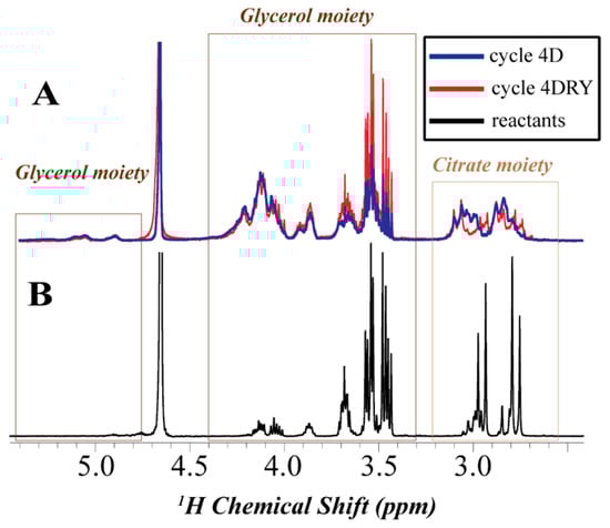 Representative 1 H NMR spectra of the glycerol-citric acid polymerization products in D2O along with general peak assignments. (A) The overlaid spectra of the soluble fraction of the 4DRY sample [red] and the 4D sample [blue]; (B) The spectrum of the unreacted sample.