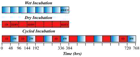 Schematic representation of experimental setup and the sampling schedule. Red squares represents the dry heating period, blue-shaded squares represent the wet incubation period. The samples were collected at the end of labeled periods.