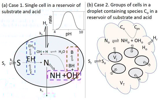 The enzyme-catalyzed reaction network we considered here was inspired by the enzyme urease described in detail elsewhere [,], where S is the substrate and EH (active form of the enzyme) is the active form of the polyprotic enzyme which binds to the substrate to give product, N: