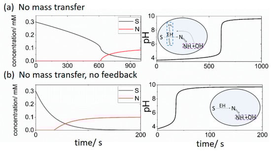 Changes in concentrations of substrate S and product N (left) and pH (right) in a closed cell with the initial [S] = 0.3 mM, [BH + B] = 0 mM, pH = 3.7, ki = 0 and (a) with feedback (pH dependent R1) (b) without feedback (pH independent R1). Insets illustrate processes considered in the cell model.