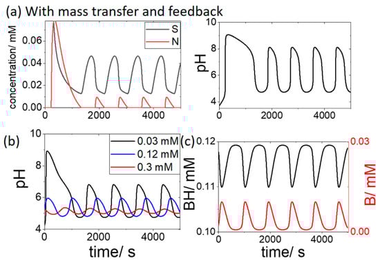 When the mass transport of species from an external reservoir of constant concentrations was included, we obtained oscillations in pH. The differential transport of acid and substrate was essential for the observation of oscillations, i.e., the transport rate constant kH > kS. This is in agreement with earlier work on pH oscillations in some enzyme-catalyzed reactions [,,]. Oscillations typically require positive feedback coupled with delayed negative feedback. The net rate of the transport of acid into the cell increased with increasing difference between the inner and outer pH, i.e., as the pH increased the rate of transport of acid into the cell increased. Therefore, the acid provided the necessary delayed negative feedback that terminated the autocatalytic, base-producing process.