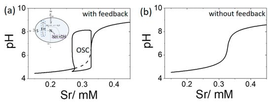 A bifurcation diagram is plotted in Figure 4a for the open system showing cell pH as function of substrate concentration in the reservoir, [Sr], with pHr = 4.3 and [BH + B] = 0 mM. Oscillations occurred for a range of substrate values from 0.27 mM to 0.33 mM. Outside of this region, a low pH steady state (pH 4) was observed at low substrate concentrations, and a high pH steady state (pH 9) was obtained at high substrate. If the feedback term in R1 was removed, then no oscillations were observed for any values of Sr (Figure 4b).