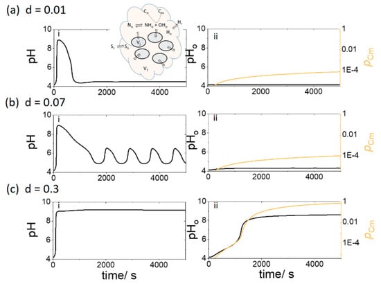 Gelation in outer solution of fixed volume, VT, with an increasing density of cells (through d, where d = nVj/VT) with pHr = 4.1, [Sr] = 0.3 mM, [BH] = 0.03 mM and [Co] = 3 mM. (i) pH in enzyme cells and (ii) pHo and extent of conversion of C, pCm, in outer solution where d = (a) 0.01; (b) 0.07 (c) 0.3.