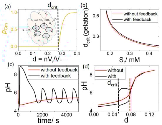 In Figure 6a, the extent of conversion, pCm, at 5000 s was plotted as a function of increasing number density of cells. There was a critical value of d above which gelation was observed in the outer solution. Below dcrit, the value of Cm increased at such a low rate that no net gelation was obtained. The value of dcrit is plotted as a function of [So] with and without feedback in Figure 6b, i.e., when the rate of the enzyme reaction R1 does not depend on acid. It is clear that feedback did not influence the pH switch and gelation in the outer solution.