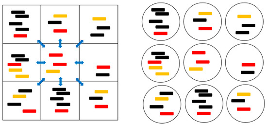 A cartoon representation of the spatial model with local diffusion dynamics (left) and the protocell models (right). The red strands are polymerases (P), orange strands are complements to polymerases (C), and black strands are parasites (X). The blue arrows indicate the possibility of diffusion to and from the eight neighboring sites.