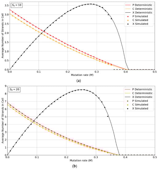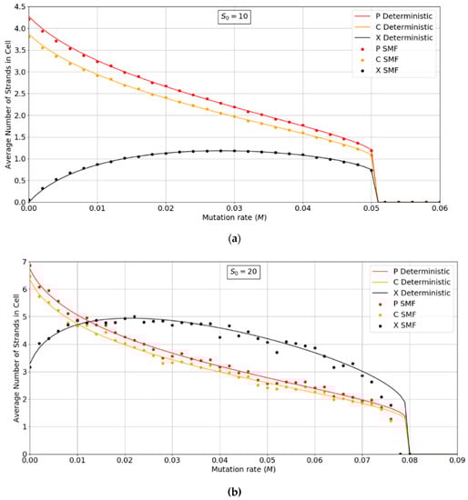 Figure 2a,b show the concentrations of P, C, and X strands as a function of mutation rate, M, for the PCP model with S0 = 10 and 20. The smooth lines are obtained from the deterministic theory in the Appendix A, which applies for infinite populations. The points are measured by simulations with N = 1024. These show typical error-threshold behavior. The numbers of P and C strands per cell decrease steadily as the mutation rate is increased, while the number of X strands passes through a maximum. There are always slightly more P than C strands, because of the (p − 1) factor in , (i.e., a P cannot replicate itself, whereas a P can replicate all C’s). All three strands die out at the error threshold, M = Mmax. The deterministic theory predicts that the strand numbers smoothly decrease to zero as M approaches Mmax. Close to this point, the expected number of viable cells in a finite population is very small; hence, the finite population simulations are vulnerable to stochastic fluctuations causing the death of the system. The average number of strands in the simulations in the long-time limit is then zero. This causes the simulated systems to die out at slightly smaller values of M than is predicted by deterministic models.