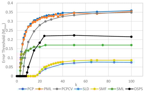The two key properties that we wish to compare between all of the models are the error threshold value, Mmax (i.e., the maximum sustainable error probability per replication of the whole sequence) and the minimum catalytic rate, kmin, required for survival of the polymerases. Figure 4 shows Mmax measured from simulations as a function of k. The estimates of Mmax were obtained by running a series of simulations at each value of k and then gradually adjusting the mutation rate to zero in on the error threshold. A similar method was used to produce Figure 5, where S0 was held fixed.