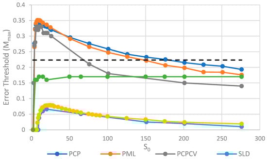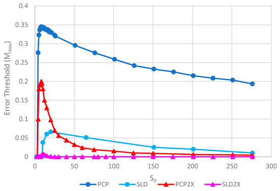 Error thresholds versus S0 for PCP and SLD models in which parasites and polymerases have equal replication rates (same as Figure 5) compared with equivalent models where parasites have double the replication rate of polymerases (denoted PCP2X and SLD2X). Both error thresholds are reduced when the parasites multiply faster, but the SLD model is reduced more, meaning that the relative advantage of the protocells over the spatial model is increased. Note that Mmax = 0 for S0 > 20 for SLD2X, because faster parasites kill the polymerases in the spatial model. k = 25 and h = 0.4.