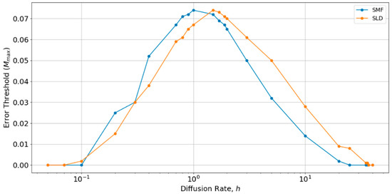 Comparison of the error thresholds of the spatial models with long distance diffusion and local diffusion as a function of the diffusion rate h. Made using S0 = 10, k = 25.