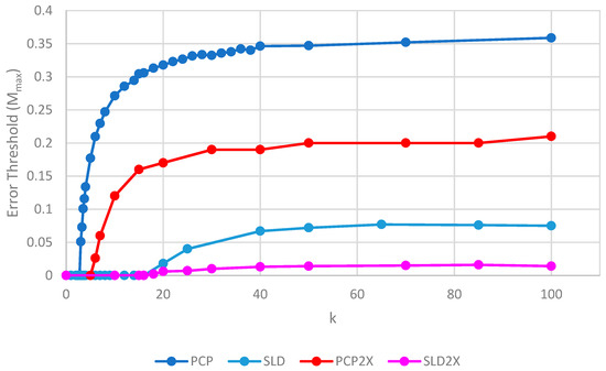 Error thresholds versus k for PCP and SLD models in which parasites and polymerases have equal replication rates (same as Figure 4) compared with equivalent models where parasites have double the replication rate of polymerases (denoted PCP2X and SLD2X). Both error thresholds are reduced when the parasites multiply faster, but the SLD model is reduced more, meaning that the relative advantage of the protocells over the spatial model is increased. S0 = 10 and h = 0.4.
