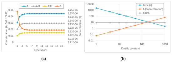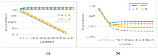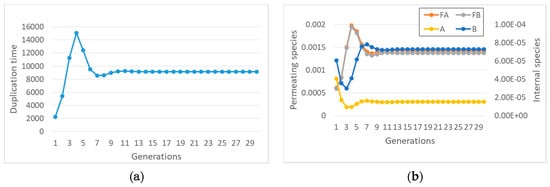 Synchronization in a quadratic model with two replicators and finite transmembrane diffusion rate, described by Equation (13). On the x-axis: generation number; on the y-axis: (a), duplication times; (b), concentrations at splitting time-please note that the concentration values are measured at the end of each protocell growth: the initial concentrations of the first generation are all equal to 0.001 M. Parameters are protocell radius r = 1 × 10−6 m; membrane thickness δ = 1 × 10−8 m; external concentrations FA* = 0.01 M and FB* = 1 × 10−2 M; kf = 1 × 103 s−1M−2; ηf = 5 × 103 s−1M−2; KFa = KFb = 8 × 10−19, equivalent to a product DaKa = 1 × 10−12 m2/s, Da being the coefficient of diffusion and Ka the partition coefficient. The KF* coefficient includes the thickness of the membrane and a form factor due to the shape of the cell. In this work we focus on spherical cells, so it holds that (see the Supplementary Materials). The same relationship holds for all the next figures, in which we will only indicate the most indicative product DaKa.