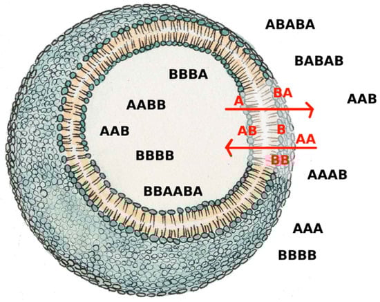 The polymer model is reviewed in Section 3. Note that its dynamical behavior depends upon the environment in which the reactions take place. In the past, we studied the formation of ACSs in different environments [40,41], which mimic some features of a dividing protocell: in both cases the concentrations of chemicals that are neither incoming from outside nor produced in its interior tend to vanish over time. So both flow reactors and growing and dividing protocells are able to select those chemical species that are internally produced, using “food” molecules coming from outside. However, they are not identical. A particularly significant difference is that the inflow in a flow reactor is determined from outside, while the internal reactions play no role. On the contrary, in a semipermeable protocell the inflow of permeating species depends upon the concentration differences between the internal water phase and the external environment, and therefore depends upon what is happening inside the protocell. Moreover, in a flow reactor all the chemical species exit in the outflow, while in a semipermeable cell some remain trapped inside.