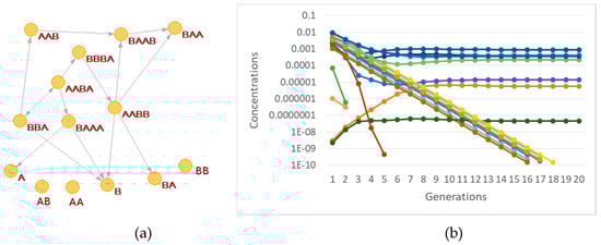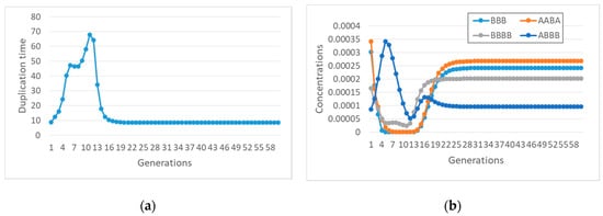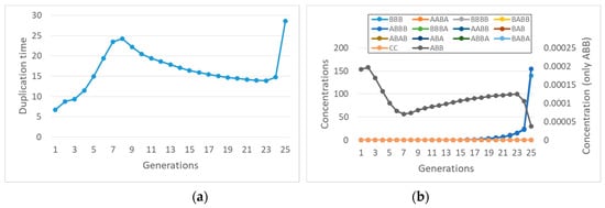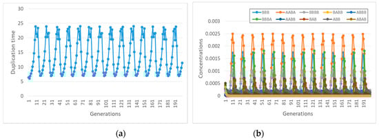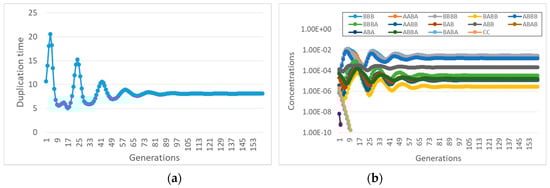 An intriguing type of synchronization, with oscillatory behavior. The reaction system is shown in Figure 6, ABB is coupled to the container growth (α = 8), simulation with finite diffusion rate. (a) duplication time; (b) concentrations of different species. In this situation, only three species—out of 13 belonging to the complete RAF of Figure 6—disappear (with the same parameters as Figure 7).