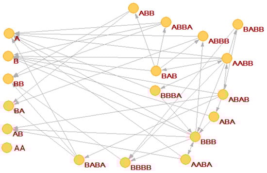 As has been observed in Section 1, the new chemical species may be present at a much lower concentration than some of the old ones; this requires a stochastic treatment that is provided by the Gillespie algorithm, which is asynchronous (a single reaction takes place at each time step, the elementary time step being very small). If we want to represent those species that are there in our system, we cannot make use of only those involved in the chosen reaction. Nor can we, in general, include all the species, since some reactions are so rare that the products they generate are not present at significant levels. The empirical way out of this conundrum is choosing a time window, and considering only the species that are involved in some reactions in the window (unless, of course, they are nonreacting species). The length of the time window sets the length of the system memory. We can provide in such a way a network representation of our system, including only the active species and their reactions, which provides useful information (while depending, of course, upon the length of the window).