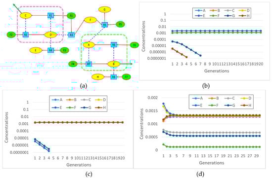Different asymptotic states reached in semipermeable protocells starting from different initial conditions (protocell radius r = 1 × 10−7 m; membrane thickness δ = 1 × 10−8 m; DaKa = 1 × 10−10 m2/s; kcl = 1 × 103 s−1M−1; kcond1 = 2 × 103 s−1M−1; k−1cond1 = 1.486 × 101 s−1; kcond2 = 1 × 103 s−1M−1; the external chemical species are buffered at 0.001M, whereas all internal chemical species—Including food-have the same initial concentration, equal to 1 × 10−5 M) (a) The chemistry: the “food” chemical species are represented by means of green ellipses; the internally produced substances by yellow ellipses; the reactions by blue blocks. The presence of two autocatalytic cores is highlighted: the survival of the other chemicals depends (in various modes) on them. It should be noted that the formation of chemical G depends on the simultaneous presence of the two nuclei. (b) The synchronizing system in case of initial conditions without species B. (c) The same, starting without species D. (d) The same, starting without species B and C.