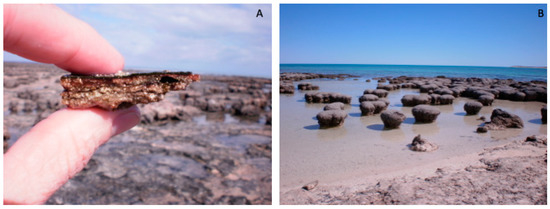 Images of (A) microbial mats and (B) stromatolites in Shark Bay, Western Australia.