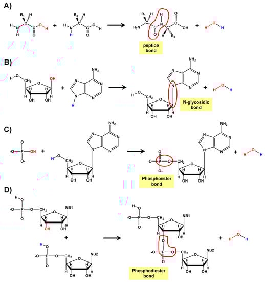Formation of biopolymers was one of the crucial steps in the sequence of organizational events that led to the origin of life on earth [1,2,3,4,5,6,7,8,9]. Peptides, polynucleotides, and polymeric carbohydrates are considered essential biopolymers for life. Interestingly, in most cases, their formation takes place through condensation reactions, which join the corresponding biomolecular building block precursors, namely monomers. For instance, in the case of peptides, amino acids condense through a peptide bond that links them (Figure 1A). In the case of a dinucleotide, three condensation reactions are required. First with the formation of an N-glycosidic bond between a nitrogenous base (NB) and a ribose sugar (R) to generate a nucleoside (NS) as follows NB + R → NS + H2O (Figure 1B). Then a reaction between NS and phosphate (Pi) via a phosphoester bond with the formation of a nucleotide (NT): NS + Pi → NT + H2O (Figure 1C). Finally, two nucleotides react to form a dinucleotide (dNT), which is being held together with a phosphodiester bond: NT1 + NT2 → dNT + H2O (Figure 1D). It should be noted that during the formation of such a dinucleotide, three molecules of water are generated.