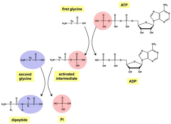 The first step involves the activation of the carboxyl group of one of the reactants by ATP (i.e., phosphorylation through its polyphosphate chain), in which a phosphoester bond is formed, and an adenosine diphosphate (ADP) molecule is released. In the second step, this activated intermediate reacts with the other reactant, in which the actual peptide bond is formed, followed by the elimination of a phosphate (Pi).