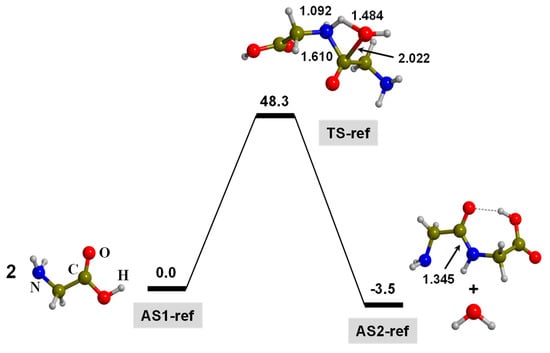 B3LYP-D3/6-311++G(d,p) free energy profile (in kcal moL−1) at T = 298 K for the condensation of two glycine molecules in the gas phase. Relative energies are with respect to two glycine (Gly) molecules infinitely separated (AS1-ref reference state). Bond distances are in Å. Pure potential energy values and including zero-point energy corrections are provided as supplementary material (Table S1).