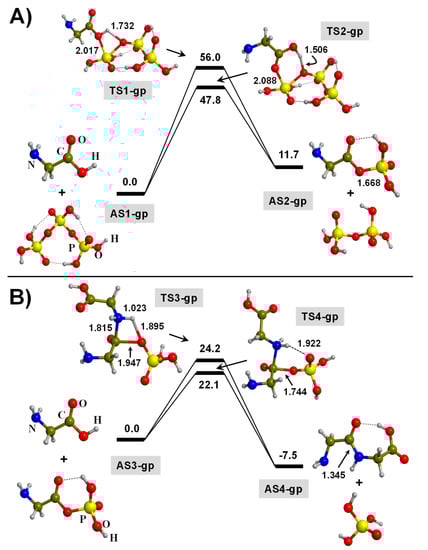 The reaction has been computed to occur in two steps (shown in Figure 4A,B). The first step is the formation of the glycylmonophosphate (GMP) as intermediate. The reactants for this step are one Gly molecule and TP (see Figure 4A). Formation of GMP occurs in a concerted way, in which Gly performs an O-nucleophilic reaction to the P atom of one of the TP ends (hence forming a phosphoester bond), followed by a proton transfer from the Gly OH group to the O atom of the phosphate bond. The O-nucleophilic reaction can be carried out by either the OH or the CO Gly groups. In the former case, the reaction takes place through a highly-strained 4th-membered ring transition state structure (see TS1-gp of Figure 4A), while in the later through a less strained 6th-membered ring one (see TS2-gp of Figure 4A). Accordingly, calculated ΔG298≠ values are 56.0 and 47.8 kcal moL−1, respectively. As a result of the process, a phosphate bond is broken, thus forming GMP and releasing diphosphoric acid. The calculated ΔrG2980 is + 11.7 kcal moL−1, namely, endergonic, due to the rupture of the highly energetic phosphate bond. It is worth mentioning that here we did not consider the formation of a pre-reactant complex (namely, the reactants interacting between them, forming a super-structure), since we assume that in the gas-phase conditions, Gly approaches to TP to directly react with it. The same assumption has been considered for the subsequent step described below.