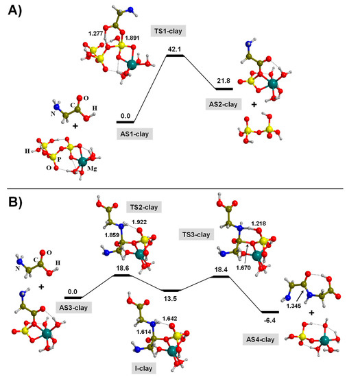 According to this energetic data, and similarly to what was observed in the gas phase, formation of Mg-GMP as an activated complex is crucial for the subsequent peptide bond formation, since from Mg-GMP the condensation presents favorable energetics, i.e., moderate free energy barriers (ΔG298≠ ≈ 18.5 kcal moL−1) and exergonic characteristics. Nevertheless, the most energetically demanding step is the Mg-GMP formation, as it has a high energy barrier (ΔG298≠ ≈ 42.1 kcal moL−1) and is endergonic (ΔrG2980 = 21.8 kcal moL−1). This endergonicity, however, exists by considering the energy differences between the two asymptotes, namely, AS1-clay and AS2-clay, but one has to keep in mind that the reactions are occurring within layers of the clay itself. In this sense, it is important to mention that we omitted typical but crucial steps in surface reactions, that is: (i) the diffusion of the reacting components in the interlayer regions to approach and be in close proximity between them, and (ii) the interaction of the products with the internal clay sheets. Both steps were omitted due to the limitation of our model that represents the clay. Since our focus is on elucidating the effects of a Mg2+ ion as a single Lewis site present in the clay sheets, we only consider the Mg2+ ion and its surroundings, this later aspect by coordinating the Mg2+ ion with four water molecules.
