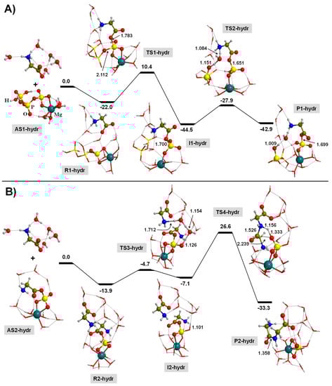 B3LYP-D3/6-311++G(d,p) free energy profiles (in kcal moL−1) at T = 298 K for the TP-mediated condensation of two glycine molecules in the presence of a Mg2+ ion and in the presence of water solvent molecules: (A) formation of the Mg-GMP-hydr activated intermediate; (B) formation of the peptide bond between Mg-GMP-hydr and a second glycine molecule. Relative energies are with respect to the corresponding AS1-hydr and AS2-hydr reference states. Bond distances are in Å. Pure potential energy values and including zero-point energy corrections are provided as supplementary material (Table S4).