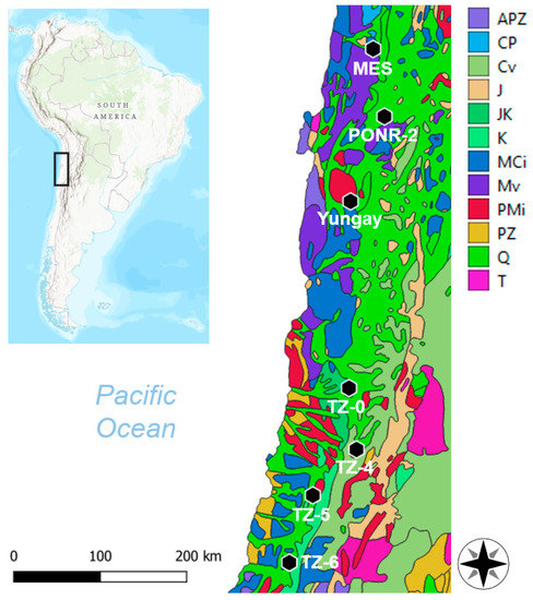 Seven study sites (María Elena South [MES], PONR-2, Yungay, TZ-0, TZ-4, TZ-5, and TZ-6) from the Atacama Desert, Northern Chile. APZ, Precambrian–Paleozoic sedimentary rocks; CP, Carboniferous–Permian sedimentary rocks; Cv, Cretaceous–Tertiary volcanics; J, Jurassic sedimentary rocks; JK, Jurassic–Cretaceous sedimentary rocks; K, Cretaceous sedimentary rocks; MCi, Mesozoic–Cenozoic intrusives; Mv, Mesozoic volcanics; PMi, Paleozoic–Mesozoic intrusives; PZ, Paleozoic sedimentary rocks; Q, Quaternary sedimentary rocks; T, Tertiary sedimentary rocks [52].