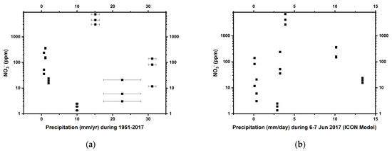 The distribution pattern of nitrate as a function of (a) mean annual precipitation (1951–2017) and (b) ICON-modeled daily precipitation (6–7 Jun 2017) in the Atacama Desert. Errors on nitrate (NO3-) measurements were smaller than the symbols.